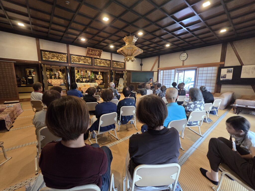 当日は、古川師の奏でる美しいギターの音色と、心に染み入るような歌声に、会場全体が包まれました。単なる演奏会ではなく、一曲一曲に込められた思いを丁寧に語ってくださり、その語りから歌へと自然に流れていく構成に、皆すっかり引き込まれておりました。